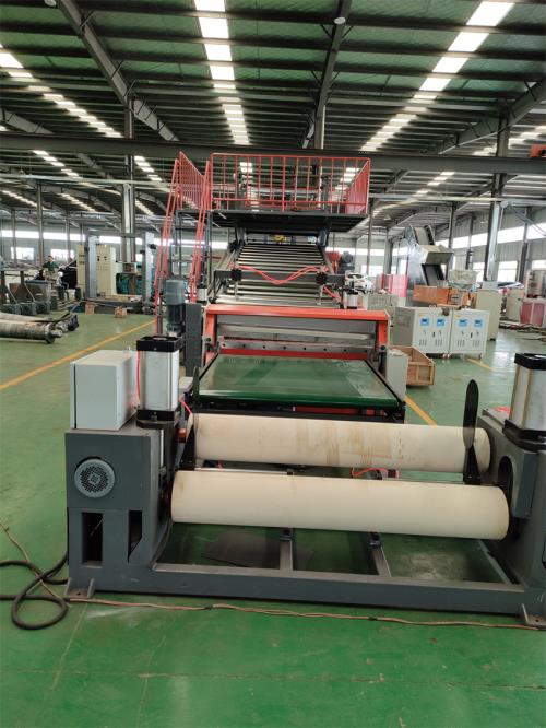不用擔心長時間使用水冷卻會產(chǎn)生水垢把冷卻器堵住,導致齒輪箱損壞3.主機水箱冷卻系統(tǒng)采用:采用環(huán)保冷卻系統(tǒng)(環(huán)保型:發(fā)明專利號CN201911312134.6)不需要接外循環(huán)水冷卻,不用徘外水;采用閉環(huán)循環(huán)系統(tǒng),4.真空泵采用環(huán)保冷卻系統(tǒng)(環(huán)保型:發(fā)明專利號:CN201911312115.3)不需要接外循環(huán)水冷卻,隔音內(nèi)飾片材生產(chǎn)線不用徘外水;采用閉環(huán)循環(huán)系統(tǒng),節(jié)約水成本:2.2KW真空泵是每小時用水量是:0.25立方,24小時*0.25立方*300天* 3元水費=5400元水費/年5.節(jié)能:普通筒體筒體冷卻;例如:第5區(qū)溫度超高;這是電子閥導通;第5區(qū)冷卻回水就會影響第六區(qū)和第四區(qū)的溫度下降;就會導致第四六區(qū)加溫;這種情況會一直循環(huán)出現(xiàn);導致電費浪費;我們現(xiàn)在采用環(huán)保型就徹底解決這個問題;我們設(shè)備比同類設(shè)備節(jié)能:10-15%電費6.三輥冷卻:水箱冷卻系統(tǒng)采用:采用環(huán)保冷卻系統(tǒng)(環(huán)保型:發(fā)明專利號:CN111745936A)不需要接外循環(huán)水冷卻,不用徘外水;采用閉環(huán)循環(huán)系統(tǒng)7.減少投資款:3米*3米*2.5米冷卻水池;60立方冷卻水塔及4KW高壓水泵2臺及管道,10天施工費用:能減少固定投資大概:10-12萬元左(二)自動翻斗提升機:參數(shù)為1、上料電機功率:2.2kw;提升料斗為不銹鋼材質(zhì),需滿足300kg/鍋,確保安全。2、隔音內(nèi)飾片材生產(chǎn)線將捏煉機捏煉后的團狀物料輸送至錐雙喂料機內(nèi)(三)雙螺桿制喂料機:一臺 1)電機功率:11kw,采用“三晶”變頻調(diào)速器。喂料螺桿:錐形雙螺桿強制下料,氮化鍍鉻處理,表面光潔度高。喂料體:內(nèi)表面拋光、鍍硬鉻處理,光潔耐磨。2)喂料斗:內(nèi)表面拋光、鍍硬鉻處理,光潔耐磨;采用鎖扣式安裝防護罩,要求便于更換和維修保養(yǎng)。可推拉式,方便移動。