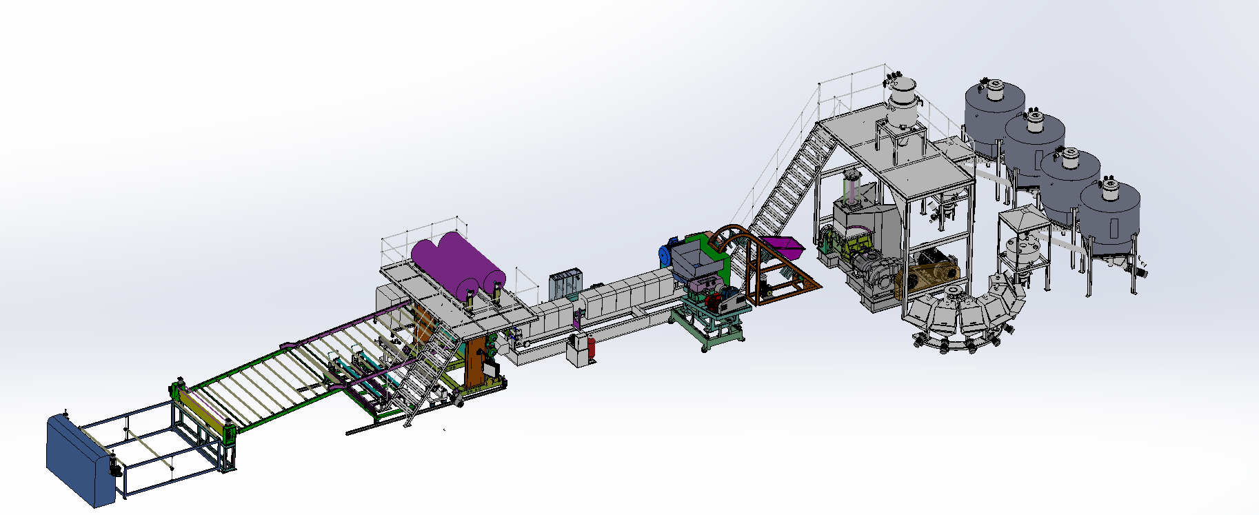 Ⅱ、擠出工藝:(上輔機(jī):自動(dòng)配料系統(tǒng))另外配置---110升密煉機(jī)-——自動(dòng)提升機(jī)——錐雙喂料機(jī)——180單螺桿擠出機(jī)——液壓板式換網(wǎng)------片材擠出模具-----三輥壓光------三輥冷卻系統(tǒng)-----下覆膜裝置----單面電暈-----托架冷卻----二棍牽引及切邊裝置----計(jì)米器----緩沖區(qū)-----在線剪板機(jī)----下料平臺(tái)----主機(jī)采用:PLC控制